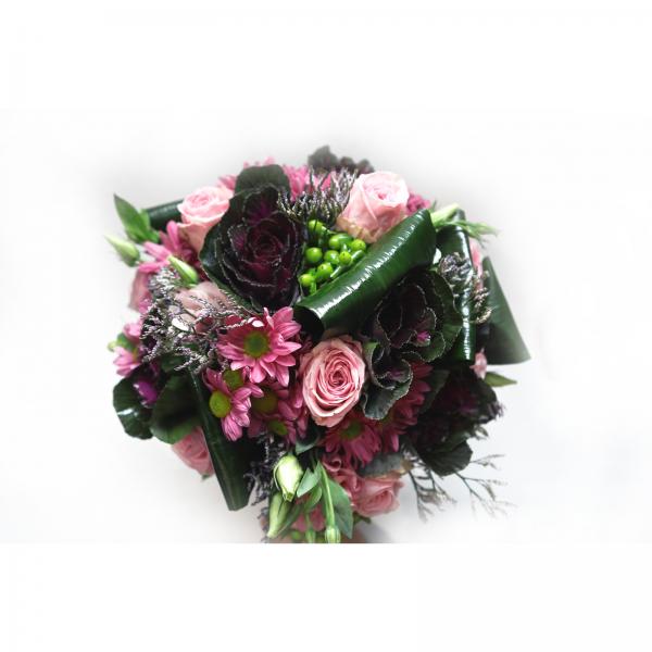 Pembe gül,biçme,lisyantus,hyperecum ve aspidstra yaprakları ile hazırlanmış kır buketi .
