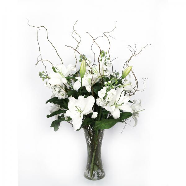 Cam vazo içine 4 lilyum , şebboy ve salix dalları ile hazırladığımız bu aranjmanı gül ve lisyantuslar ilave ederek zenginleştirebiliriz.